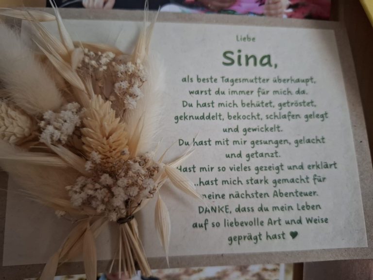 Mein Name ist Sina Mende, ich bin verheiratet und Mama zweier Töchter. Als qualifizierte Tagesmutti betreue ich bis zu 5 Kinder in Stelzendorf.